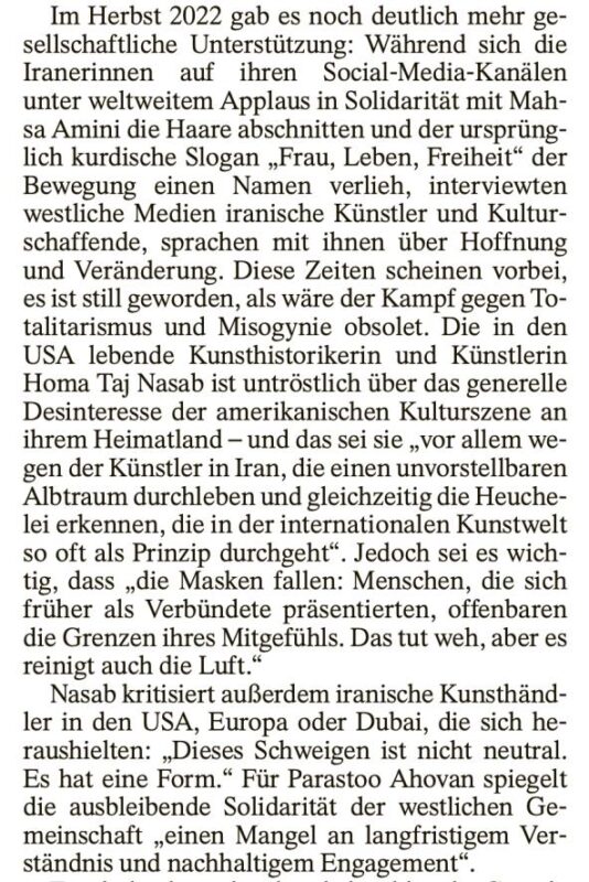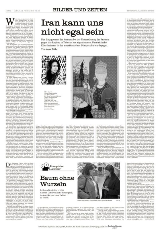 In February 2026, the Frankfurter Allgemeine Zeitung published an article by Jana Talke on feminist Iranian artists in the diaspora and the diminishing attention their work receives in the Western cultural sphere. I appeared in it briefly, quoted as an art historian and artist living in the United States. Briefly is how the international art world increasingly seems to prefer Iran: as a passing mention, a tasteful pang, a tragic aside between biennials.